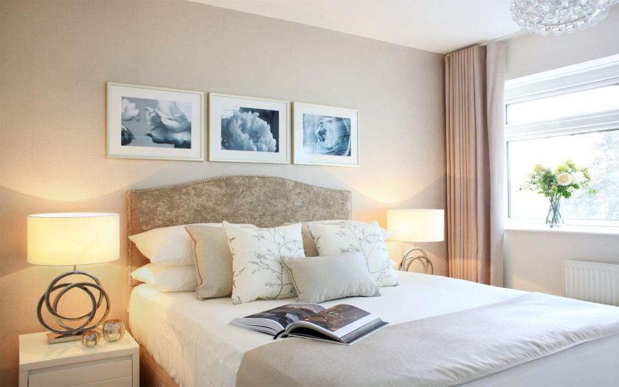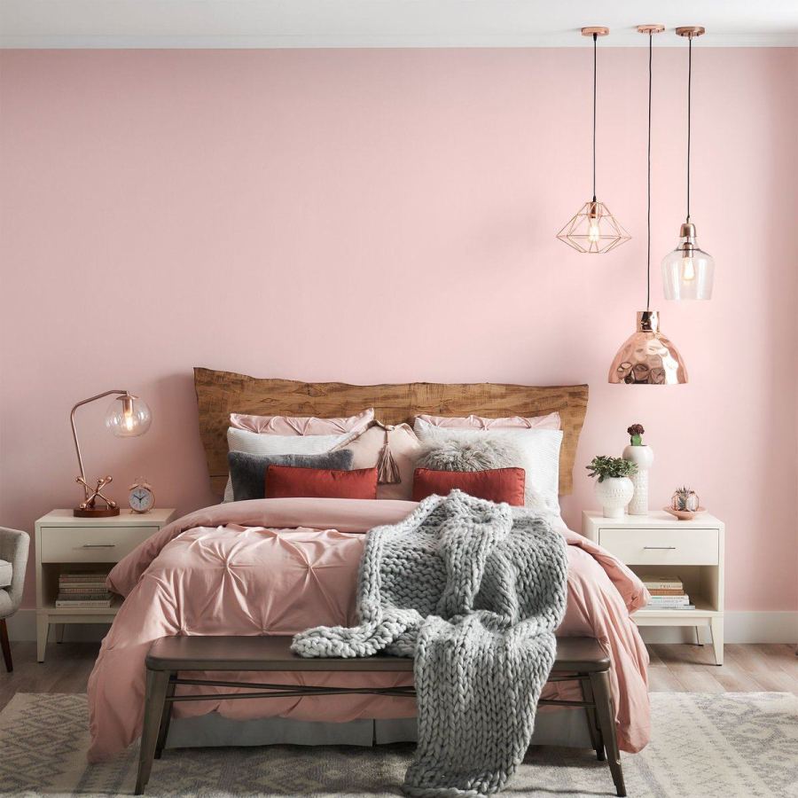 Комбинация пыльно-розового и приглушенного серого – классика интерьера спальни в пастельной гамме. Как и великолепные сочетания с синим, бежевым, белым.
