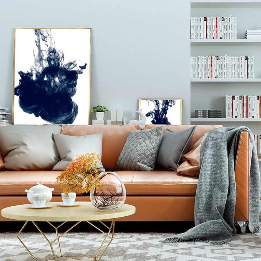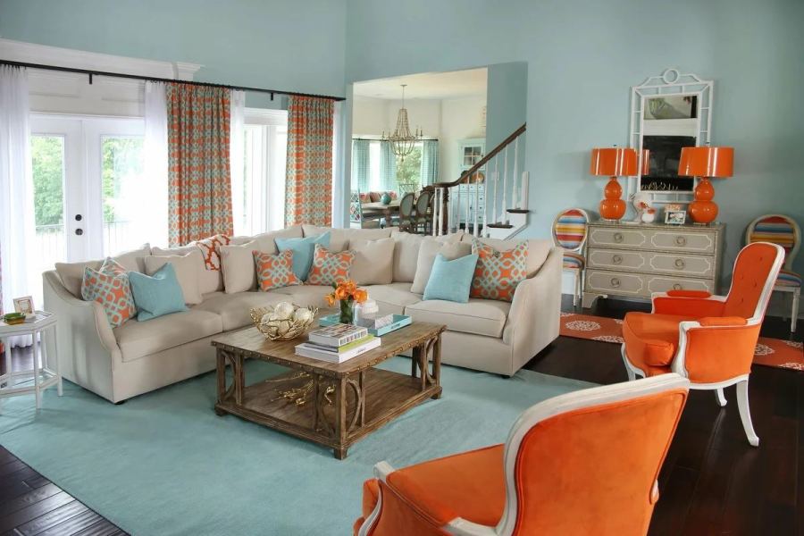 На фото гостиная, где фоновый размыто-голубой красиво компонуется с бледным и ярким оранжевым.