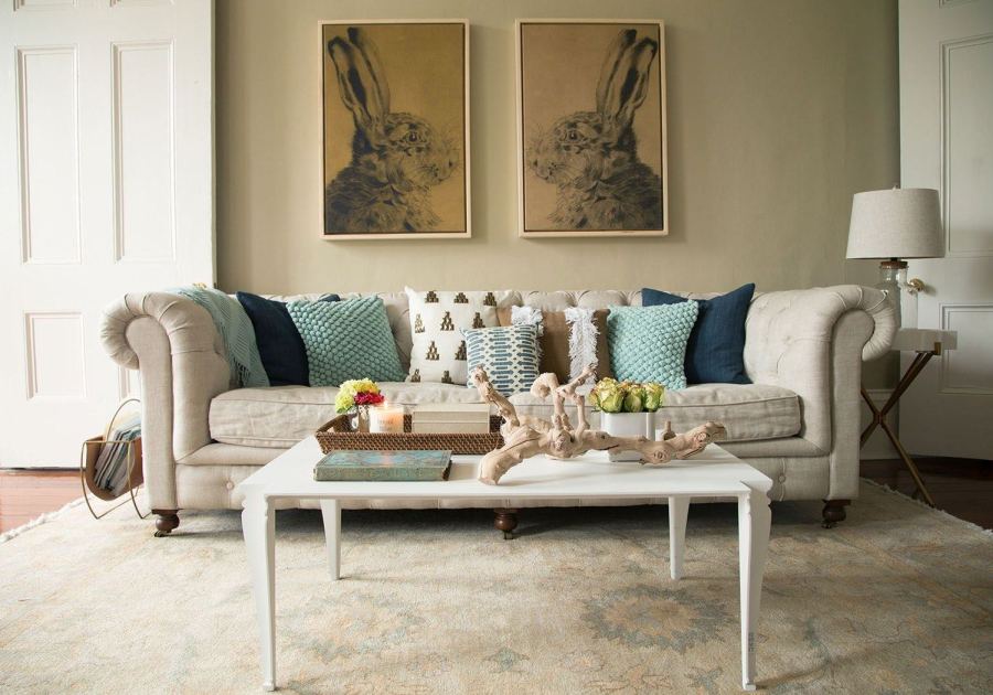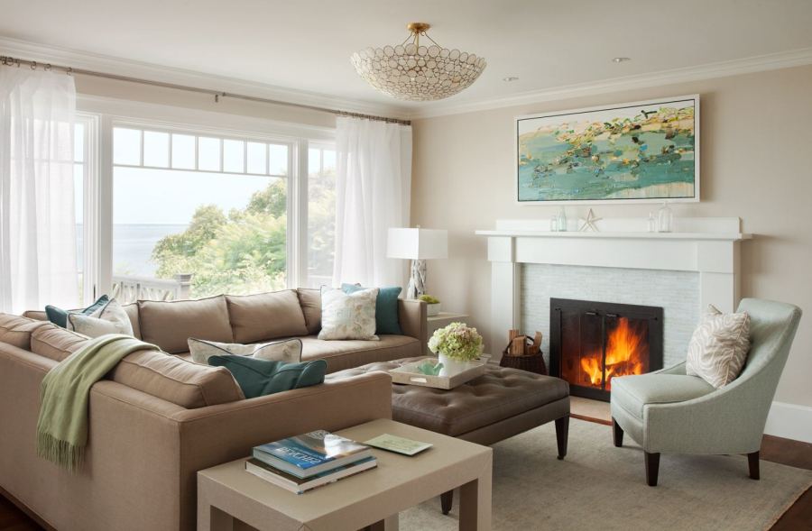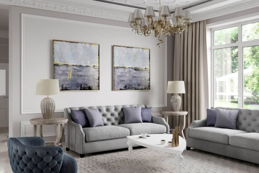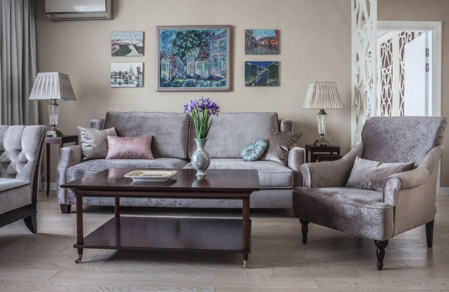 Бежевые стены и пол, абажуры цвета слоновой кости, жемчужно-серая диванная группа, пепельные шторы создают монохромную основу для отделки гостиной на фото. Яркая деталь – картины в синих тонах. Контрастно, но гармонично смотрится темно-коричневый журнальный стол. Бледно-розовые и бирюзовые подушки на диване выгодно сочетаются с бархатистой обивкой.