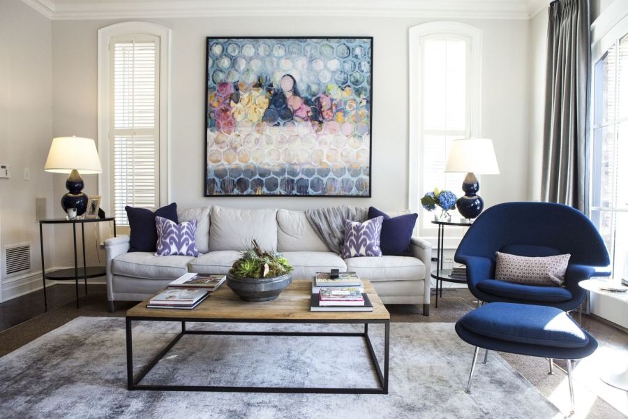 Выделенные детали сделают обстановку более выразительной и разнообразной. В качестве точек фокуса могут выступить диванные подушки, кресло, диван, картина, напольный ковер.