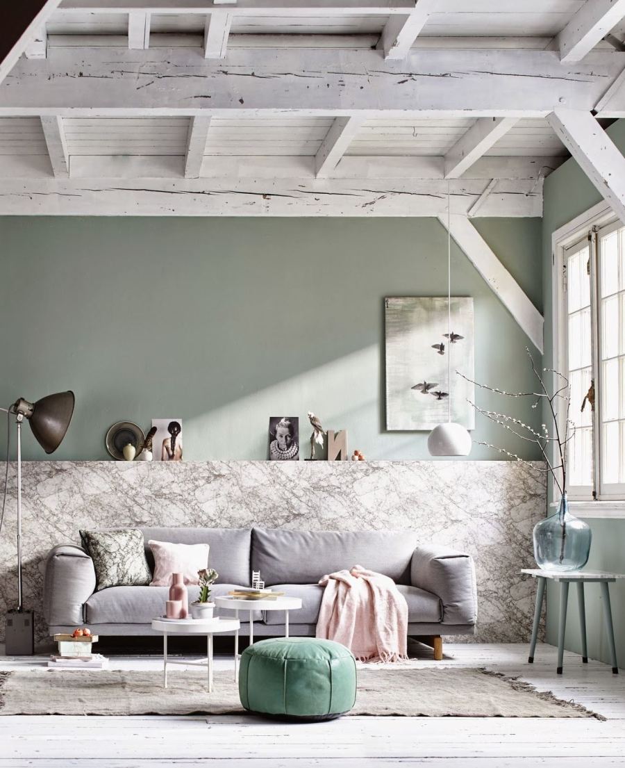 | Разбавленный серо-зеленый | Чтобы не казаться мрачным, нуждается в сочетании с белым цветом. Чудесный фон для светлого дивана и декоративных подушек в этой же гамме. |