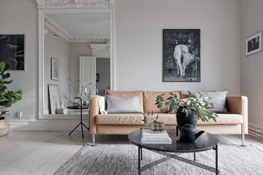 Просторная и светлая комната на фото – результат грамотного распределения колеров: для пола и стен выбран прозрачный серый, белые плинтусы и лепнина привлекают внимание к высоте помещения, пыльно-розовый диван разбавляет контраст с черной металлической мебелью.