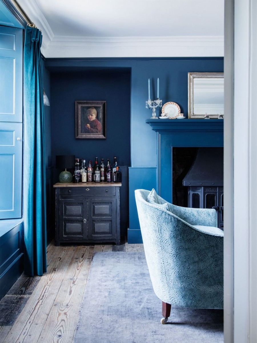 В этом примере гостиная выдержана в синей палитре: с темными стенами, бледно-голубым ковром и серо-голубыми креслами.
