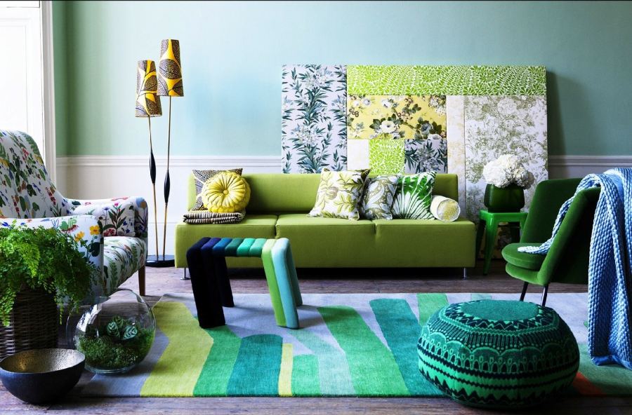 В текстильном оформлении и меблировке зоны отдыха на фото прослеживается композиция желто-зеленых и зеленых тонов разной степени плотности.
