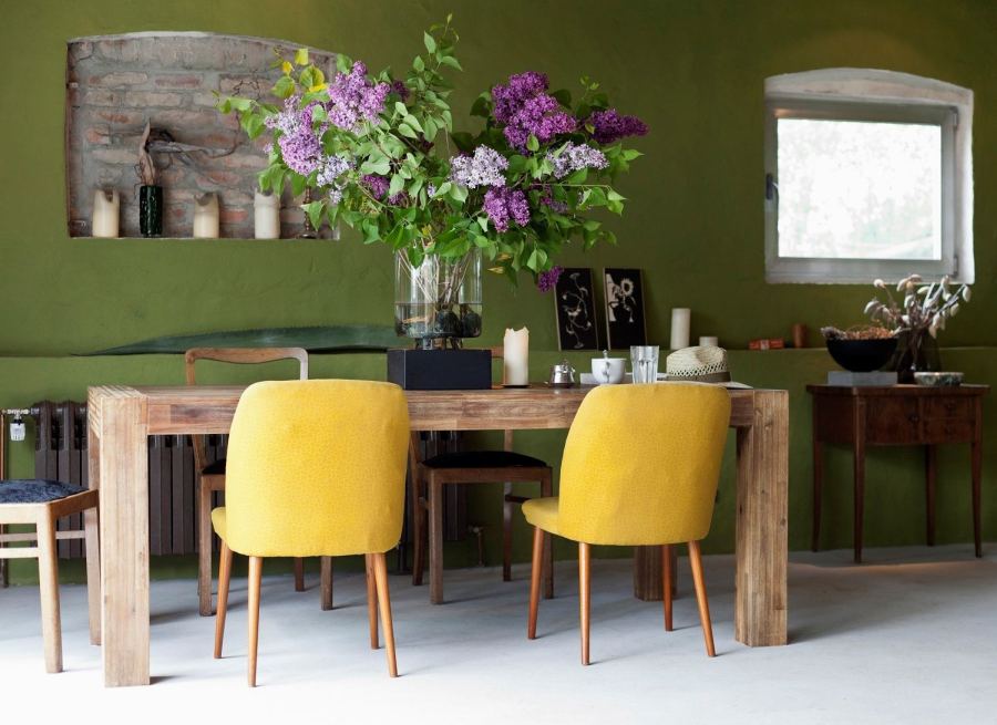 В дизайне этой столовой темно-оливковые стены красиво оттеняют горчичные кресла. Удачное дополнение – деревянная мебель с выраженным рисунком.