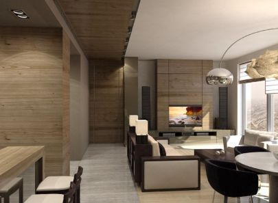 В дизайне преобладают прямые, простые формы. Их немногословность уравновешивают абстрактные картины, живые цветы и светильник фантазийной формы над обеденным столом.