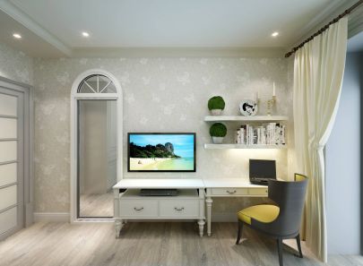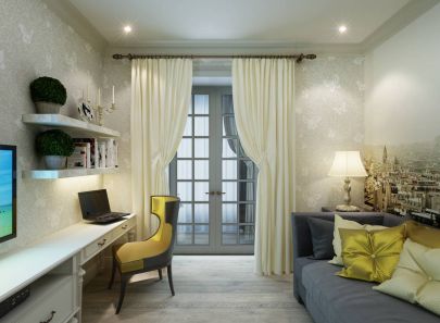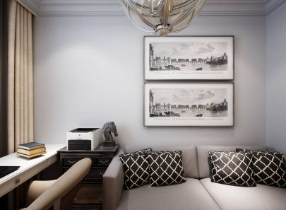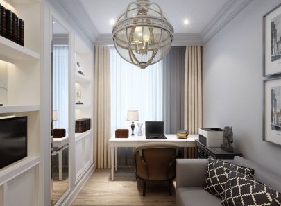 Кабинет выполнен в прохладной монохромной гамме. Белые стеллажи, письменный стол, отделка стен гармонируют с темными тонами диванных подушек, комода и настенных панно.