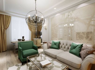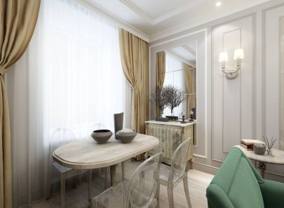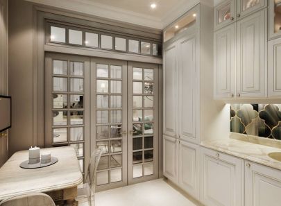 Объединенные гостиная и столовая неслучайно выполнены в белых тонах. Эта тональность расширяет пространство, делая его просторным и воздушным. Той же цели служат глянцевая мраморная отделка стены и широкие двери со стеклянными вставками, ведущие на кухню.