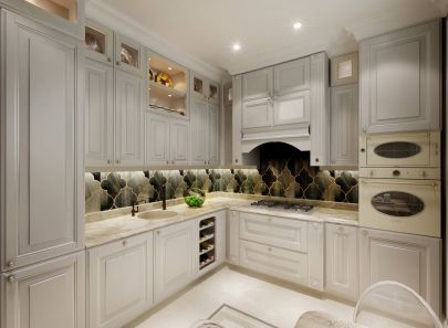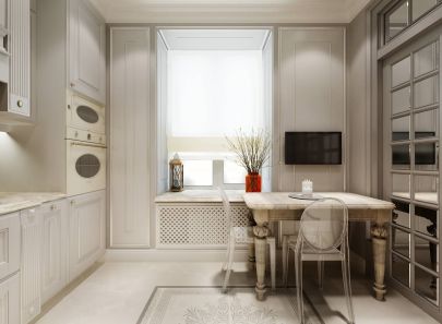 Кухня, отделенная от гостиной лишь прозрачной дверью, продолжает идею дизайна в белых тонах. Классическая светлая мебель подчеркивается эффектной яркой мраморной облицовкой. Невесомые прозрачные стулья Victoria Ghost от Philippe Starck прекрасно вписываются в дизайн кухни и столовой зоны в гостиной. При этом они вовсе не хрупкие, выдерживают любые нагрузки, не боятся мороза и солнечных лучей.