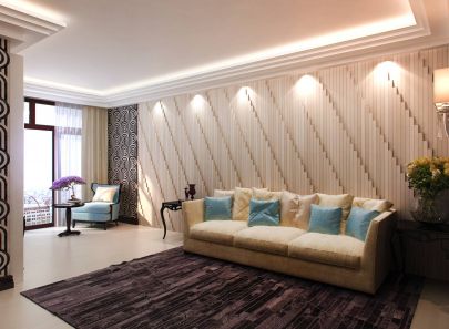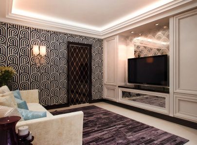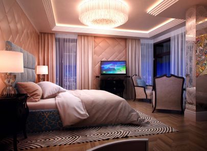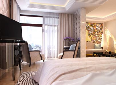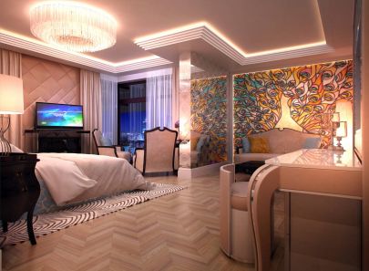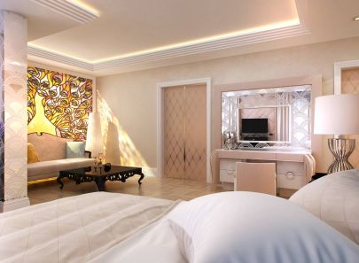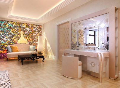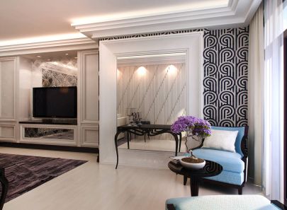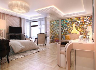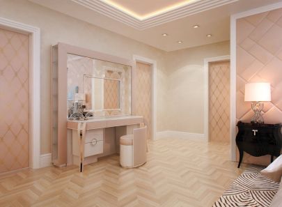Зона отдыха отделена небольшой перегородкой, орнамент которой повторяет гравировка зеркала туалетного столика. Благодаря различным светильникам возможно несколько сценариев освещения.