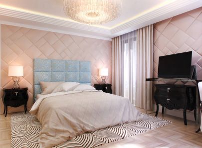 Нежное сочетание голубых и бежевых тонов передает спальне умиротворенное настроение. Особое внимание привлекает высокое изголовье кровати. В спальне, как и во всей квартире, много света. Одно из окон украшено витражом с яркой жар-птицей.