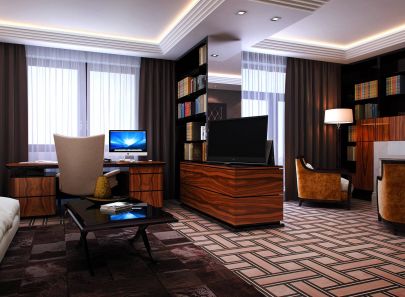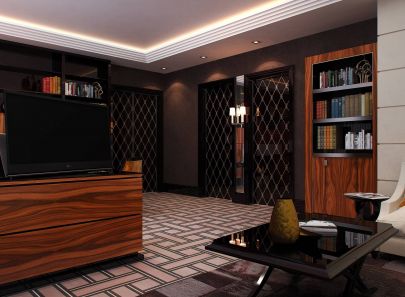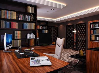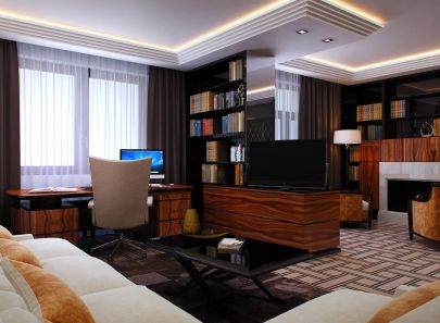 Не менее просторный, чем другие комнаты, кабинет выдержан в темных и коричневых тонах. Особенно эффектна каминная группа в сочетании с библиотекой. Материалы – мрамор и натуральное дерево.