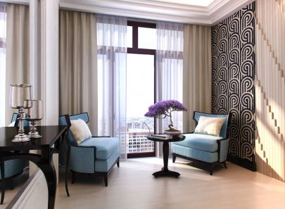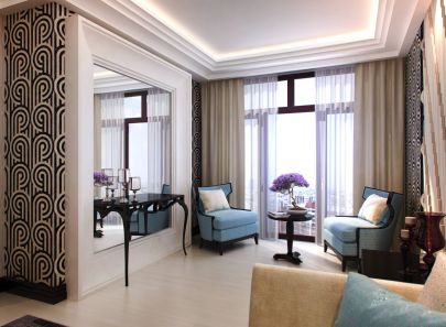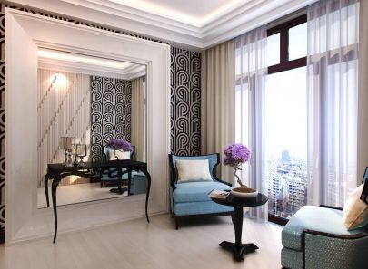 Свет и объем второй гостиной подчеркивается высокими окнами от пола и огромным зеркалом. Цветовая гамма отчасти перекликается со спальней – бежевый и голубой. Особый уют придают стоящие у окна кресла wing chair – нестареющее воплощение комфорта и достатка.