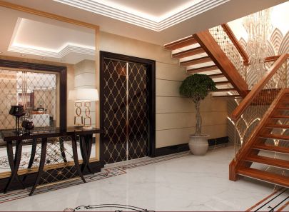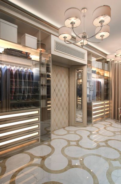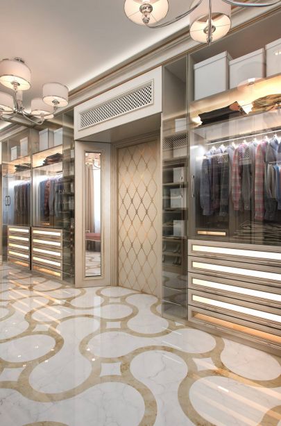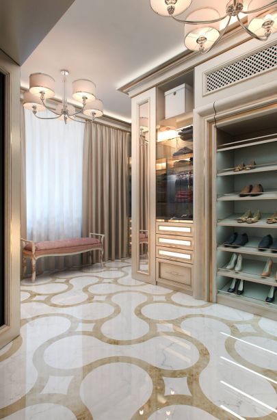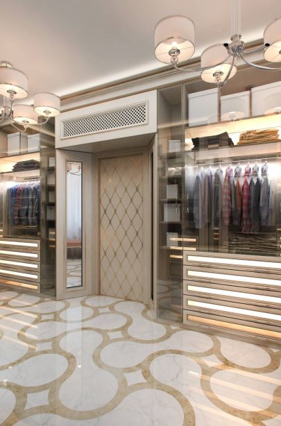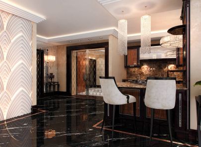 Парадный стиль квартиры задается уже в прихожей. Отделка пола мрамором с причудливым узором, зеркало от пола до потолка, огромная стеклянная дверь в гостиную с орнаментом, повторяющимся на входных и межкомнатных дверях.