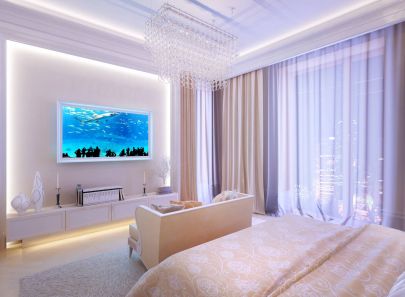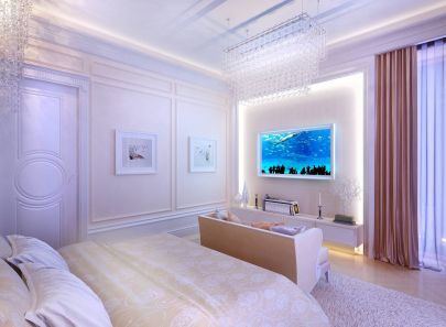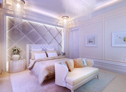 Для приватного помещения спальни выбраны мягкие бежевые и сиреневые оттенки. Освещение, фактуры, драпировки – все работает на то, чтобы создать спокойную и расслабленную атмосферу.