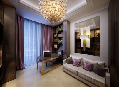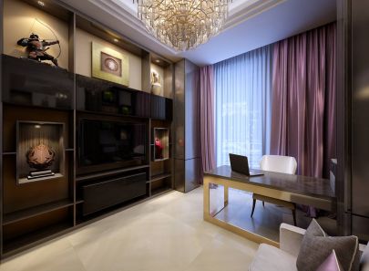 Интерьер кабинета выдержан в сочетании сиреневых и натуральных тонов. При этом создается ощущение сдержанности – для этого использовались холодные оттенки, поверхности со стальным блеском. Ниши с украшениями и декором несколько смягчают общий деловой настрой.