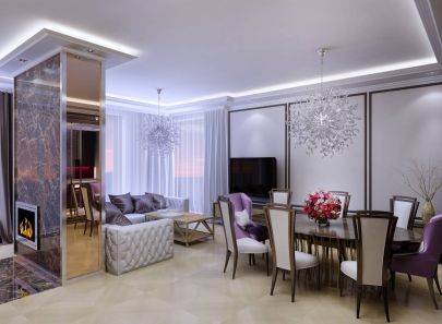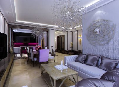 Идея свободного, открытого пространства воплощена путем объединения гостиной и столовой. К ним примыкают большой холл в сиреневых тонах и яркая кухня.