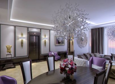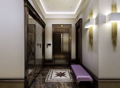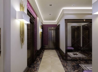 Декоративность задается уже в прихожей: светильники и эффектное панно в стиле металлик, двери с блестящим декором и зеркальный шкаф-купе, сиреневые и бордовые краски в мебели и отделке стен.