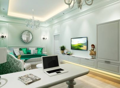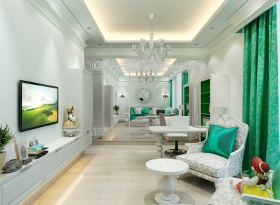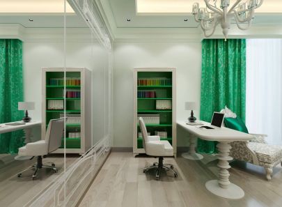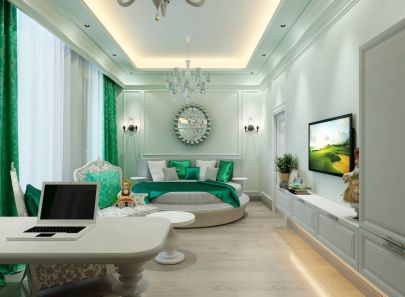 Оригинальная спальня – центр приватной зоны. В дизайне спальни вызывает восхищение яркий изумрудный цвет. Портьеры, подушки и покрывало преображают белый интерьер.