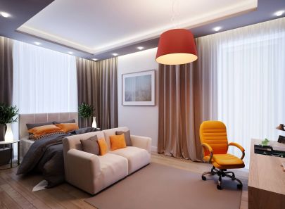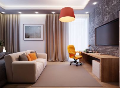 Эстафету ярких красок в интерьере перенимает бежевая детская с яркими акцентами. Желтый и оранжевый – то, что нужно для детей, ведь они так любят сочные чистые тона.