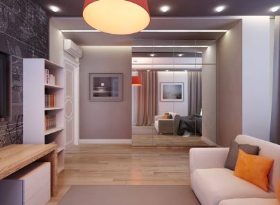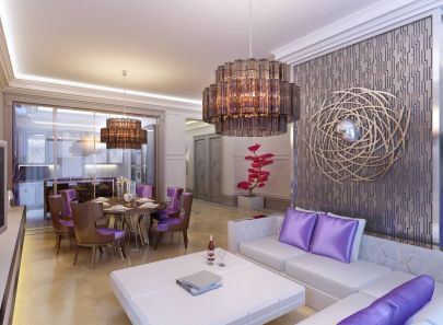 Светлая комната с акцентом сиреневого выглядит особенно выигрышно. Сиреневый придает атмосфере загадочность, он по душе творческим людям с художественным вкусом. Второй акцент – шоколадный, такой сладкий и соблазнительный, великолепен в столовой зоне.