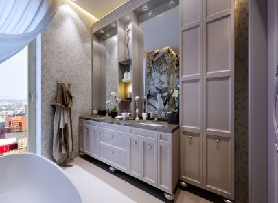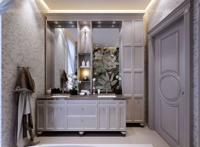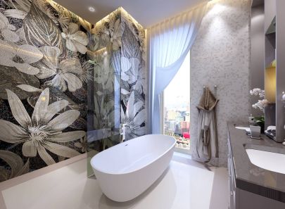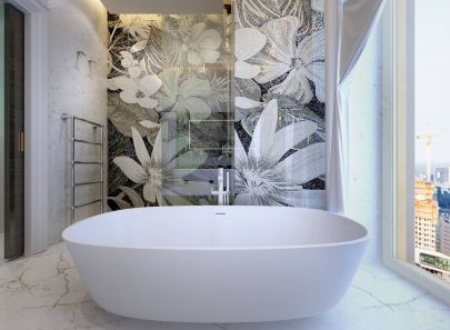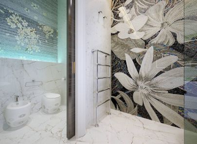 Фоном для интересных оформительских решений в квартире выбран белый. Ванная комната не стала исключением. Стены оформлены мозаикой: изумительной красоты цветочный рисунок играет здесь главную роль.