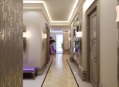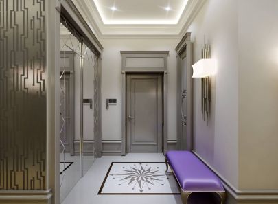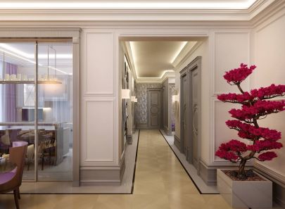 Продолжение загадочной темы – яркий сиреневый акцент в светлой прихожей. В интерьере этой квартиры много интересных цветовых находок. И одна из них – холл с малиновым акцентом (декоративное дерево бонсай).