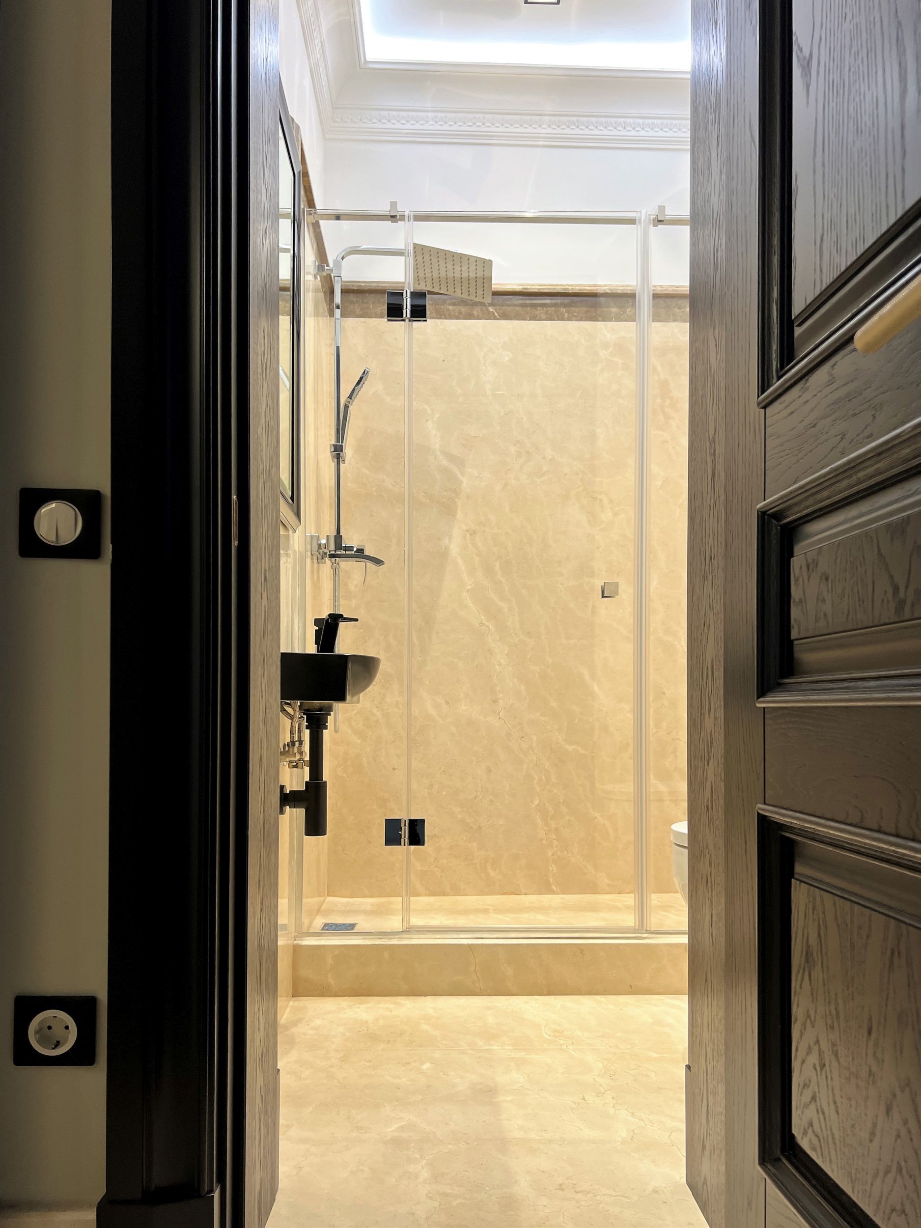 Душевая кабина в черно-бежевой ванной комнате