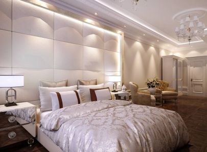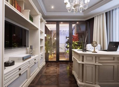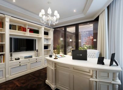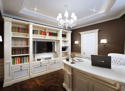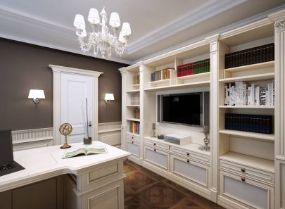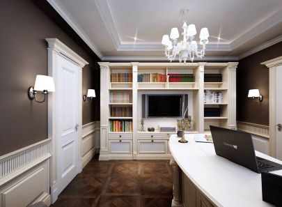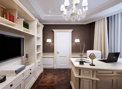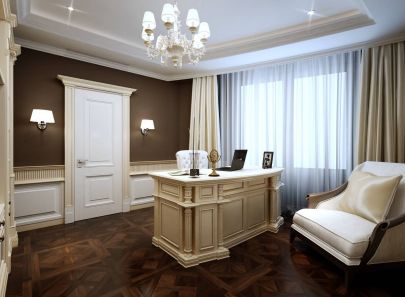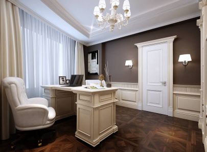 В таком кабинете хочется творить и создавать шедевры – на возвышенный лад настраивают письменный стол с богатой отделкой, подобный кафедре, стеллаж с книгами, удобные роскошные кресла. Динамику создают темный паркетный пол и стена, на фоне которой светлая дверь особенно ярко выделяется.