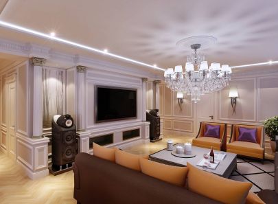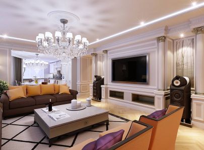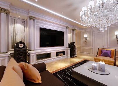 Все интерьерные детали этого стиля устремлены вверх, приподнимают потолок, что придает величественность. Вместе с тем, греческий стиль вовсе не помпезный, а сдержанный и элегантный в простоте. Поэтому минималистская мебель: диван, кресла, столик, а также современная видео и аудиотехника вписались идеально. Сочетание светлой отделки и коричневых оттенков мебели, ковра и техники очень органично.