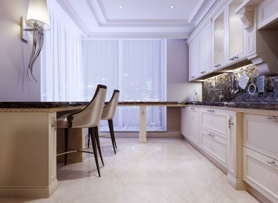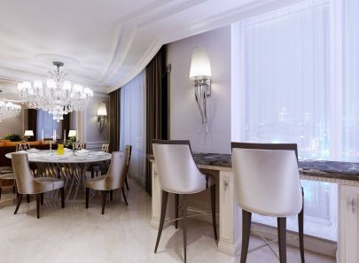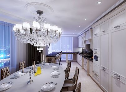 Современность на кухне – потолок с точечными светильниками, темная столешница барной стойки и фартук кухонного гарнитура в тон. Классика – кухонный гарнитур, обеденная группа и хрустальная люстра. При этом темные шторы, стена и столешница только подчеркивают нежные сливочные тона кухонной мебели и отделки.