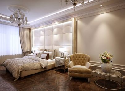 В спальне контрасты стилей и цветов смягчены, и это понятно, здесь энергия должна течь плавно и неспешно. Поэтому темный паркетный пол, кресла, отделка подушек воспринимаются как небольшая горчинка, оттеняющая сладость светлых зефирных оттенков.