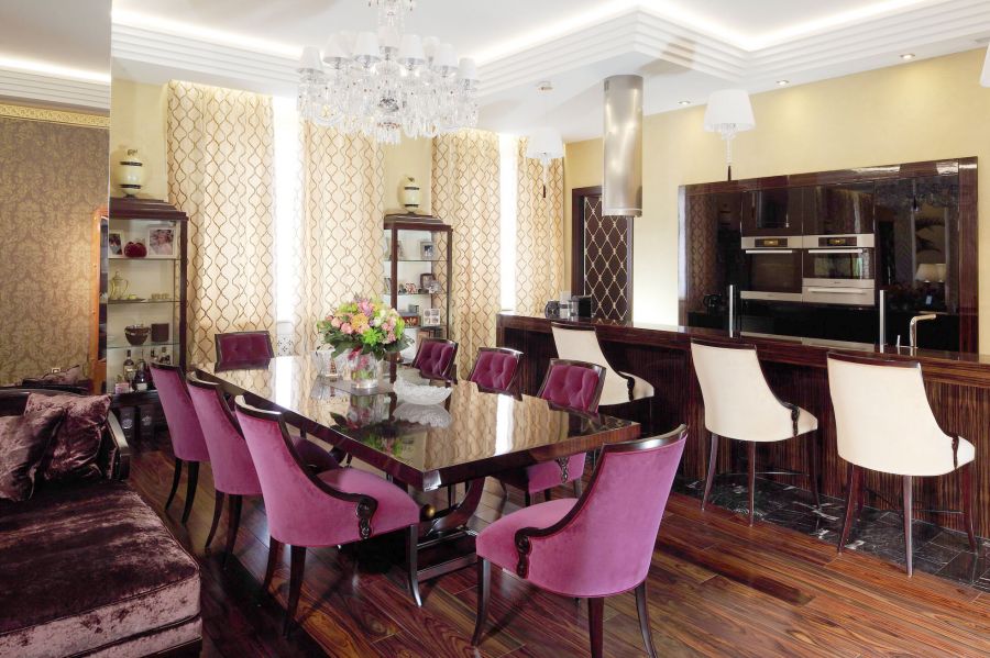 - Цветовой акцент в обеденной зоне – мягкие стулья оттенка темной фуксии. Благородный компаньон для насыщенного коричневого тона стола и парных посудных витрин.