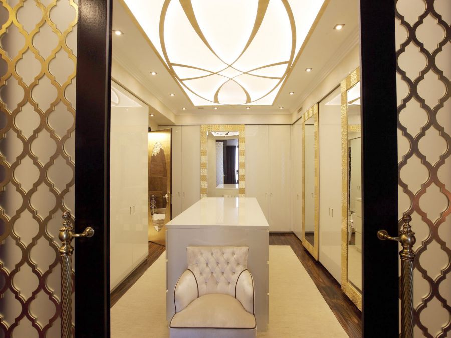 Установленный по центру комод оставляет достаточно места для прохода к встроенным шкафам. Для отделки глянцевых фасадов выбран теплый оттенок слоновой кости, который выгодно сочетается с золотистыми обрамлениями настенных зеркал. Зона ярко освещается точечной подсветкой по периметру и дизайнерским потолочным витражом.
