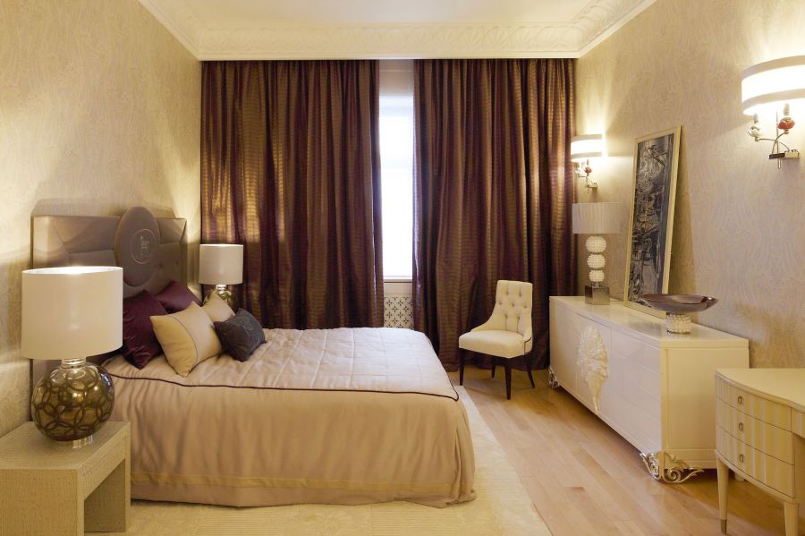 Дизайн помещения миксует классические мотивы в декоре потолка и туалетного столика, элементы арт-деко в виде комода на серебристых фигурных ножках и современного стиля с его стремлением к простоте линий. Преобладают нежные карамельные оттенки, оживленные контрастными темными шторами цвета сепии.