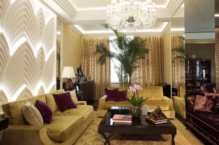 Оформление прихожей задает тональность всей обстановке, построенной на сочетании роскошных отделочных материалов. Черный мраморный пол инкрустирован глянцевой и матовой плиткой, она образует рисунок из треугольников и квадратов в центре зоны. В лакированном покрытии отражается золотистая потолочная ниша с подсветкой. Изящный золотой декор украшает входную и межкомнатные двери, черную пристенную консоль, обрамление широкого зеркала. С темными элементами отделки красиво контрастирует нежный кремовый оттенок стен, который переходит из прихожей в парадную часть интерьера.