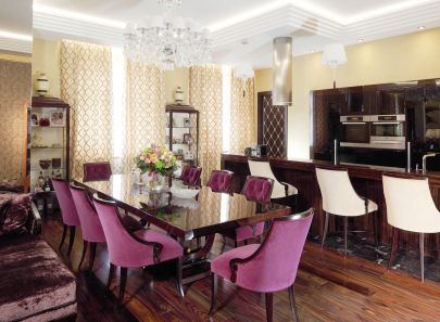 - Цветовой акцент в обеденной зоне – мягкие стулья оттенка темной фуксии. Благородный компаньон для насыщенного коричневого тона стола и парных посудных витрин.