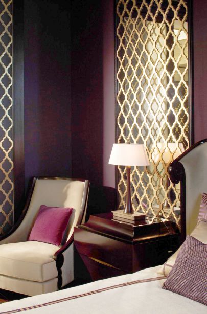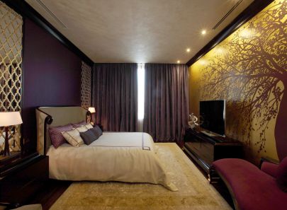 Текстильное оформление вводит нейтральные светлые цвета, которые удачно оттеняют базовую палитру: белое кроватное изголовье, белое кресло, бежево-кремовый ковер. Еще один фокус внимания – шезлонг в углу комнаты, с бархатной пурпурно-розовой обивкой. Чтобы не нарушать господство темной гаммы, гладкий потолок окрашен в спокойный бежевый оттенок, который по своей природе отлично соседствует с большинством цветов.