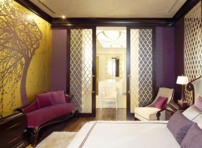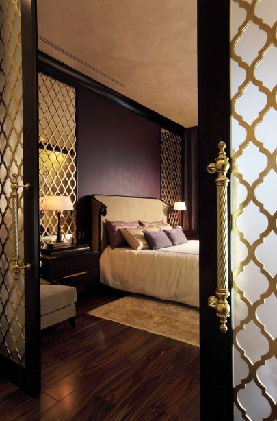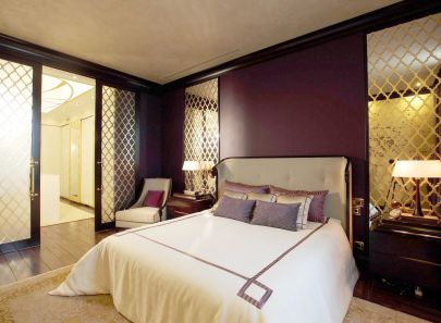Классический стиль дизайна привнес в трехкомнатную квартиру богатую аристократичную атмосферу. Метраж комнаты позволил использовать насыщенные темные краски в большом количестве и при этом сохранить ощущение свободного пространства. Стены окрашены в глубокий бордовый оттенок, который создает прекрасный фон для акцентного декора: стена напротив кровати украшена золотистым панно, зеркала по бокам изголовья – ажурными позолоченными накладками, как и ведущие в гардероб раздвижные двери.