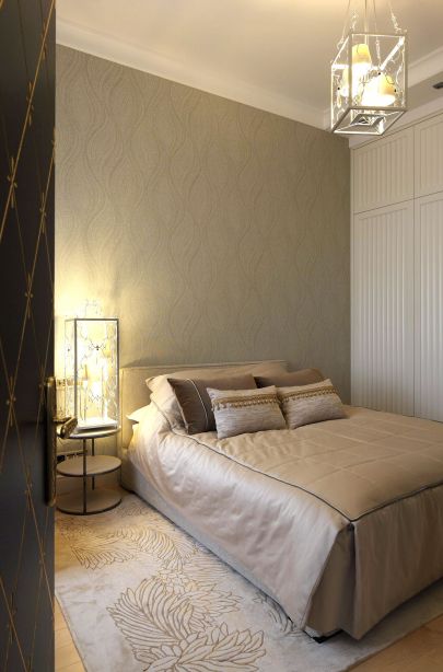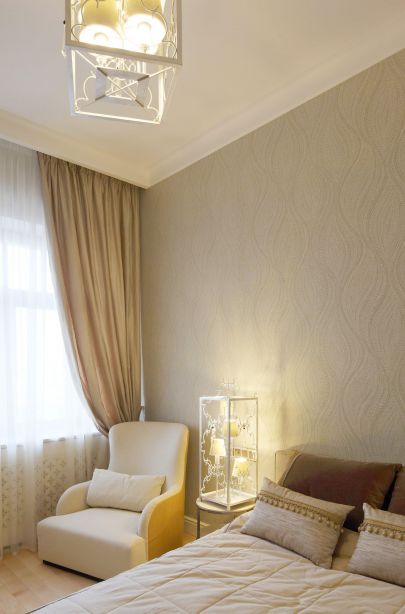 Дизайн помещения миксует классические мотивы в декоре потолка и туалетного столика, элементы арт-деко в виде комода на серебристых фигурных ножках и современного стиля с его стремлением к простоте линий. Преобладают нежные карамельные оттенки, оживленные контрастными темными шторами цвета сепии.