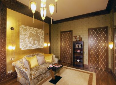 Оформление прихожей задает тональность всей обстановке, построенной на сочетании роскошных отделочных материалов. Черный мраморный пол инкрустирован глянцевой и матовой плиткой, она образует рисунок из треугольников и квадратов в центре зоны. В лакированном покрытии отражается золотистая потолочная ниша с подсветкой. Изящный золотой декор украшает входную и межкомнатные двери, черную пристенную консоль, обрамление широкого зеркала. С темными элементами отделки красиво контрастирует нежный кремовый оттенок стен, который переходит из прихожей в парадную часть интерьера.