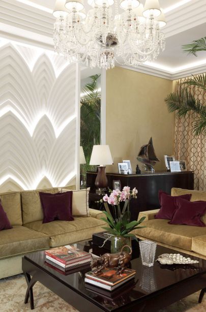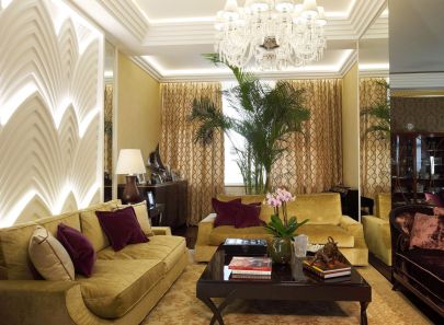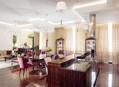 Большая площадь квартиры позволила реализовать комфортные планировочные решения: объединить гостиную с кухней, обустроить для каждой спальни собственный санузел, организовать гардеробную комнату. Декоративная составляющая активно работает с фактурами, темными цветами и орнаментальными узорами.