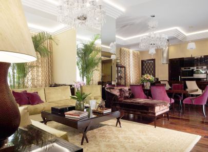 Выполненный проект классического дизайна трехкомнатной квартиры совмещает пространство в единый светлый объем. Хорошее естественное освещение дают три фронтальных окна. В вечернее время каждая из зон освещается собственным источником, плюс по периметру помещения подключается встроенная подсветка в фигурном подвесном потолке.