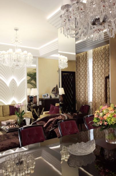 - В дальней от прихожей части комнаты располагается место отдыха – с двумя диванами, журнальным столиком, телевизором, мини-пианино у окна. Оливково-бежевая гамма мягкой мебели и ковра органично сочетается с темно-коричневым деревянным полом, белой резной панелью на стене, золотисто-коричневыми обоями в ТВ-зоне, позолоченным рельефным карнизом. Зеркальные панели по бокам объемного панно подчеркивают идею классической симметрии. На границе со столовой зеркалами обшита выступающая перегородка – она раздвигает пространство гостиной, а заодно служит композиционной опорой для шикарного шезлонга с бархатной кофейной обивкой.