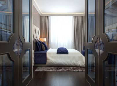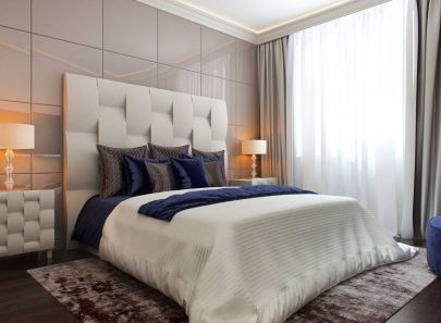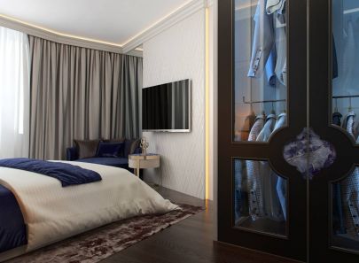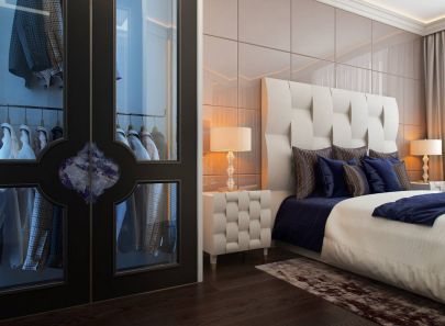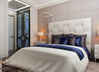 Интерьер выдержан в нейтральных бежево-коричневых тонах с включением темно-синего (текстиль) и фиолетового (столик на золотых ножках). Спальная зона акцентирована трехмерными панелями в оформлении изголовья кровати и фасадов прикроватных тумб, а еще глянцевыми настенными панелями. По обеим сторонам прохода встроены гардеробные шкафы с прозрачными дверцами. В их декоре присутствует натуральный камень, как у столешницы, это связывает интерьерную композицию воедино.