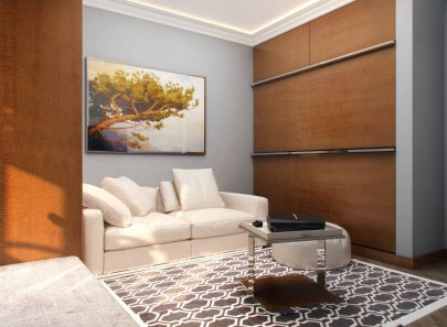 Отдельное помещение проект 5-и комнатной квартиры отводит под игры в приставку. Пространство предельно лаконично: здесь расположен диван, пуф, большой телевизор. Чтобы тренировать не только мозг, но и тело, на присоединенной лоджии организован спортивный уголок с тренажерами и шведской стенкой. Как и в гостиной, лоджия приподнята на подиум, подчеркивающий ее границу. Фиксируя римские шторы на разной высоте, можно регулировать уровень освещенности.