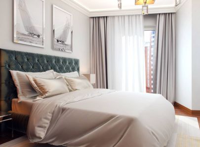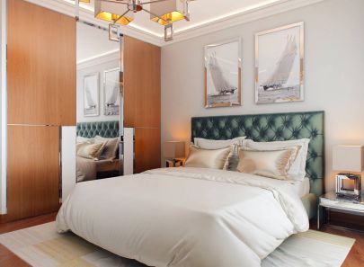Ее оформление более светлое: праздничный белый комбинируется с ярким светло-коричневым деревом. Сияния добавляют хромированные элементы в отделке шкафа-купе, светильников, прикроватных столиков, фоторамок. По планировке место напротив кровати занимает зона отдыха, которую можно превратить в рабочую. Дизайн серо-зеленого дивана с каретной стяжкой повторяет изголовье кровати.