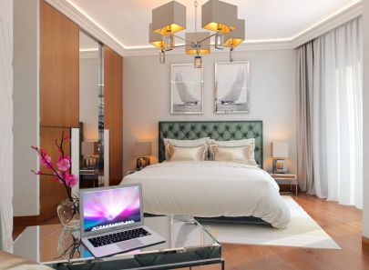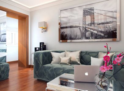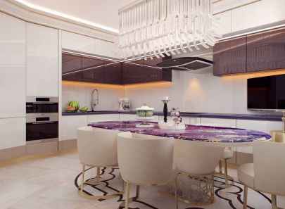 Интерьер в современном стиле выдержан в белой гамме с несколькими цветовыми акцентами (золотым, коричневым, фиолетовым). Позолота вносит в светлую и нарядную обстановку долю роскоши, умело вписанную в урбанистический пейзаж. Лейтмотив декора – сочетание острых углов и плавных контуров.