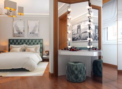 Искусственной перегородкой обозначена зона углового туалетного столика, ее боковая зеркальная панель переходит на лоджию, усиливая естественное освещение в комнате.
