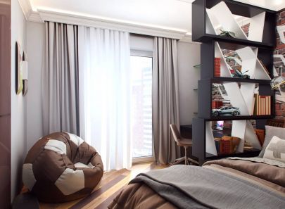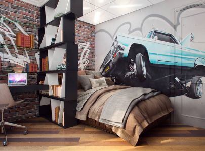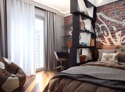 Интерьер комнаты для подростка оформлен в стилистике лофт: с кирпичной кладкой, граффити, принтами. Встроенный шкаф-купе с глянцевым фасадом задает коричневый акцент на светлом фоне. Сочетание разноцветных напольных досок – намек на юношеское бунтарство, как и асимметричные полки стеллажа на границе рабочего и спального места.